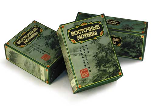А вот упаковка зеленого китайского чая "Восточные мотивы" - это уже авторская работа Елены Толокониной. Требования заказчика к будущей упаковке были таковы: даже при беглом взгляде на коробку покупатель должен сразу понять, что в ней китайский зеленый чай. Следуя этому завету, и было решено использовать в упаковке мотивы традиционной китайской живописи по принципу круговой панорамы. Надпись "зеленый китайский чай" нанесена также по канонам китайской живописи, как пишутся названия картин - вертикально. А подпись автора - традиционная красная печать. В данном случае роль подписи на упаковке играет маркировка массы продукта - "100 г". И это не просто "активное красное пятно", это важный элемент создания достоверного образа "зеленый китайский чай" (12).